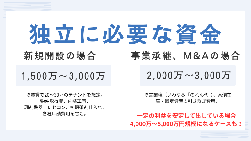 上記を踏まえて、独立するに際しての障壁が少ないという点では「M&A」と「事業承継」が有力な選択肢となります。いわゆる「のれん代」がどこまでコストが掛かるかという問題はありますが、それまで営業してきた店舗なので患者の傾向や売り上げ見込みなどの経営数値もつかみやすい。また既存の備蓄医薬品もそのまま譲り受けることができるので、承継後の借入金がどの程度必要か、経営が軌道に乗るまでどのくらいの期間がかかるかなど、ある程度の予測が可能です。ただ、開業直後は売上が安定しないことを前提に、家賃や人件費、追加の薬剤仕入れに充てる運転資金として、少なくとも3〜6ヵ月分、数百万円規模の余力を確保しておくことが重要です。調剤報酬は請求から入金まで一定のタイムラグがあるため、この点を軽視すると資金繰りに窮するリスクが高まります。